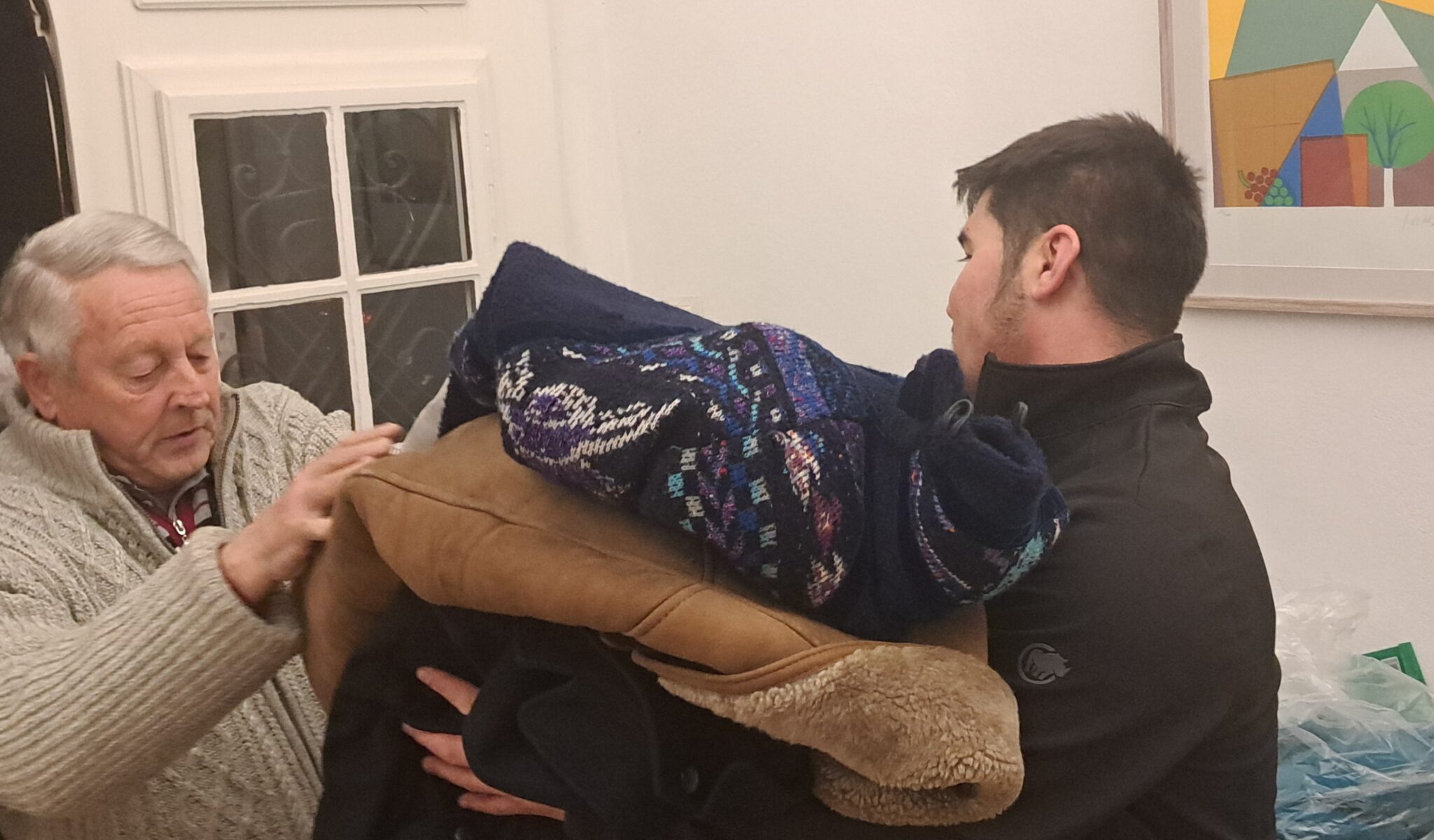 Alcune famiglie tornano direttamente dalla settimana bianca e portano spontaneamente la loro attrezzatura da sci e la biancheria termica. Un uomo si toglie la sua pregiata giacca di piuma, la lascia lì e torna a casa in maniche di camicia. Molti non si conoscono affatto, restano per aiutare e tutti sono felici di poter dare un contributo. Alle 22:30 due minibus sono già carichi.